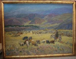 Картина представляет собой пейзаж с глубокой перспективой. На переднем плане изображена предгорная долина, где пасутся овцы, а чабан верхом на ослике наблюдает за стадом. Вдали видны горные хребты, увенчанные отсветами под чистым синим небом. Основная цветовая гамма произведения основана на оттенках охры, зелёного, коричневого и синего.