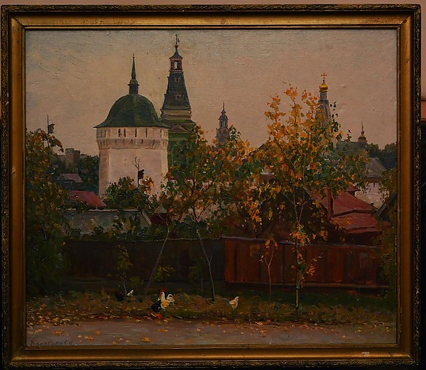 Полотно представляет собой ведуту с фронтальным изображением дома, ограждённого забором, и деревьями с пожелтевшей листвой. На переднем плане изображены пёстрые куры и петух, что подчёркивает жанровую детализированность сцены. На втором плане выделяются верха плотничьей и каличьей башен, а также шатёр церкви Зосимы и Савватия Соловецких Троице-Сергиевой лавры. Цветовая гамма работы выдержана в зелёных, жёлтых, оранжевых и серых тонах.