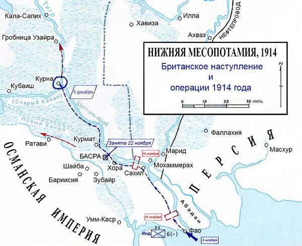 10 октября британская армия оккупировала южный Ирак в целях защиты нефтяных месторождений АПНК. Войска с только что прибывшим подкреплением под командованием генерал-лейтенанта сэра Артура Баррета подошли к Басре, которую обороняли малый отряд из турок и местных, и выбили их оттуда.