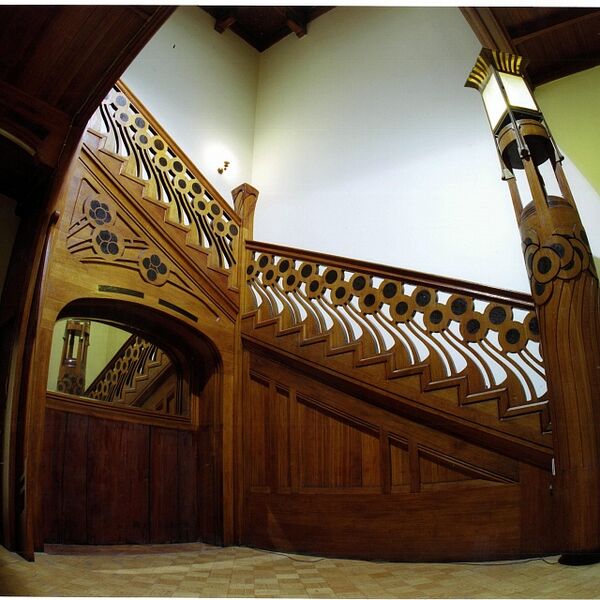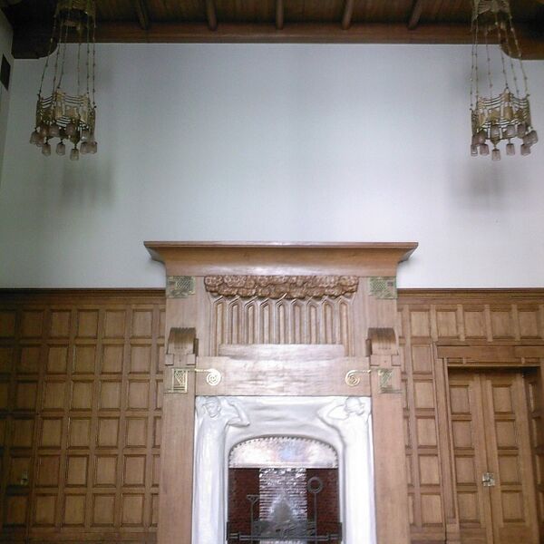 Камин в кабинете украшал беломраморный рельеф с фигурами панафинейских всадников. Шехтель часто цитировал этот античный образ и использовал его как своеобразный автограф во всех главных творениях[27]. Над скульптурами к потолку шёл асимметричный перспективный портал, оформленный многочисленными светильниками-пирамидками[34].