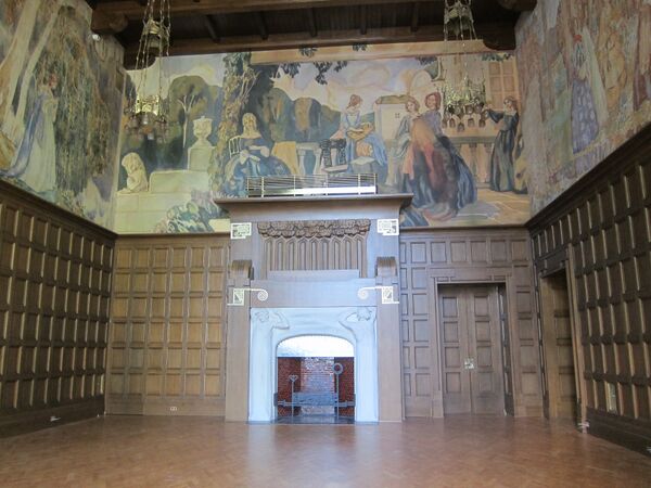 Продолжая тему античного храма, Шехтель планировал украсить главную гостиную росписями на тему времён года. Фрески должны были располагаться по всей поверхности потолка и верхней части стен, а их общая площадь составить 250 м². Исполнителем архитектор пригласил молодого художника Игоря Грабаря, Ознакомившись с его эскизами, Дерожинская предложила гонорар в 5 тысяч рублей вместо 10, которые озвучил живописец, поэтому контракт заключён не был. После Грабаря Шехтель пригласил своего друга, уже признанного мастера Виктора Борисова-Мусатова, однако хозяйка отвергла и его работу[31]. Поскольку Шехтель был в отъезде, убедить заказчицу так же, как ему удалось в случае с Зинаидой Морозовой и панно Михаила Врубеля, было невозможно. Борисов-Мусатов писал коллеге Александру Бенуа: