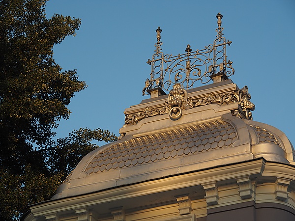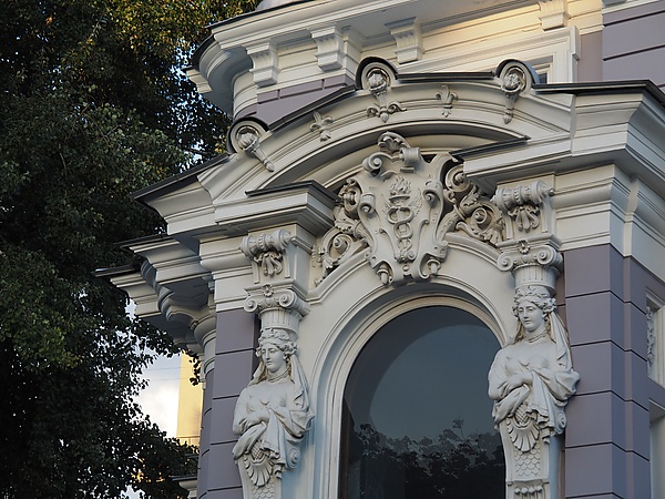 Боковой фасад декорирован ещё обильнее: в центр помещён ризалит с выразительной эдикулой, по сторонам от него расположены каннелированные колонны. Капители и фриз венчаются лепными пальметтами и волютами. От овального окна второго этажа сделаны трёхчастные широкие оконные проёмы, которые завершают гермы с женскими головками[17].