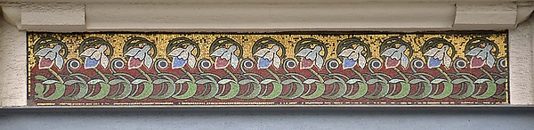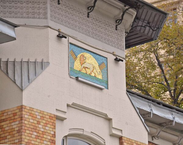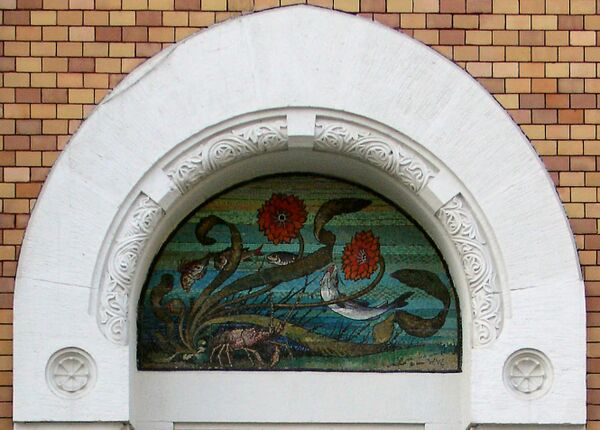 В арочной нише над порталом входной двери расположено полихромное мозаичное панно с изображением водорослей и обитателей подводного мира. В правом нижнем углу панно имеется монограмма «W. W.», более в застройке Москвы нигде не встречающаяся. Судя по этой подписи, предположительным автором панно является другой известный мастер московского модерна, сотрудник бюро Кекушева в период проектирования гостиницы «Метрополь» и его коллега по работе в Московском торгово-строительном акционерном обществе — Вильям Валькот, который подписывал некоторые свои эскизы и графические работы аналогичным образом. Между первым и вторым этажом по уличному ризалиту идёт орнаментальный мозаичный фриз с изображением на золотом фоне подснежников. Как в предыдущих, так и в последующих работах Кекушева оформление фасадов мозаикой более не встречается[94][84].