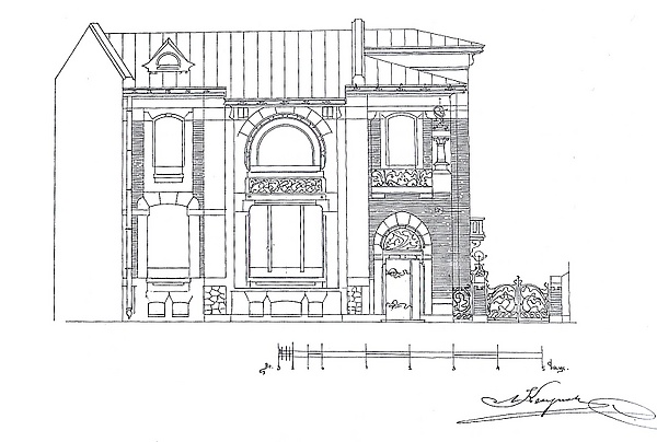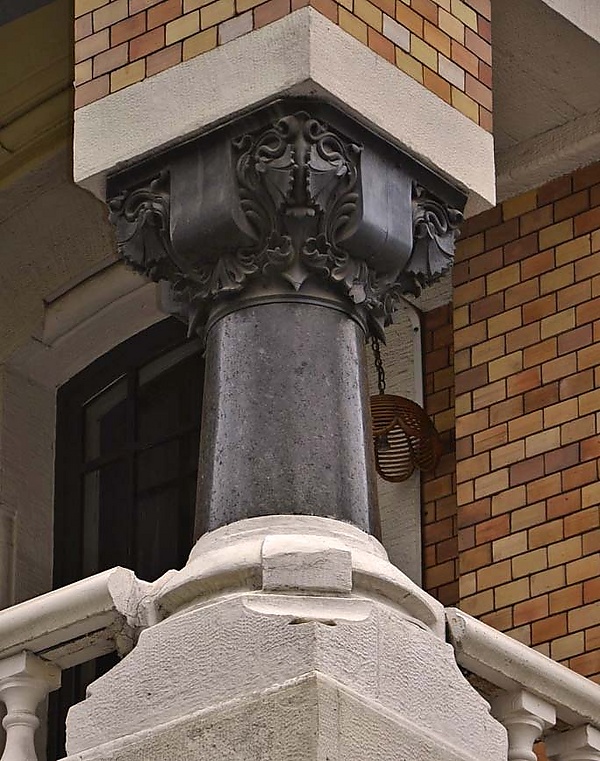Плоскости фасадов прерывает угловая лоджия, использование которой в композиции, по мнению искусствоведов Е. А. Борисовой и Т. П. Каждан, объясняется свойственным Кекушеву тяготением «к нарочитой усложнённости фасадов»[89]. Затенённый проём лоджии придаёт композиции дополнительный контраст и подчёркивает пластичность выполненной из полированного чёрного гранита гротескной толстой колонки, увенчанной развитой цинковой капителью с растительным рисунком. Сильно вынесенный металлический карниз и высокий прямоугольный рельефный аттик над лоджией придают особняку новаторский для времени его постройки вид сооружения с плоской кровлей[90][91][92].