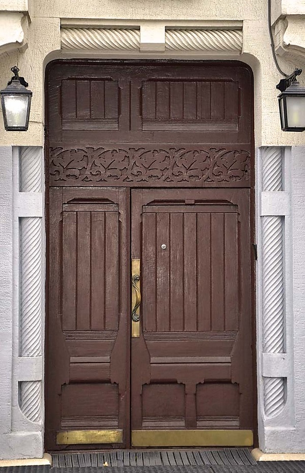 Обладая свойственными модерну характеристиками, здание, вместе с тем, несёт отпечаток стилизованных мотивов романского зодчества, подмеченных архитектурными обозревателями ещё в начале XX века. Их присутствие видно в рисунках деревянного полотна входной двери и каменных растительных орнаментов, проявляется в использовании отдельных ордерных элементов, оформлении массивного цоколя и трактовке колонки лоджии[83][84].