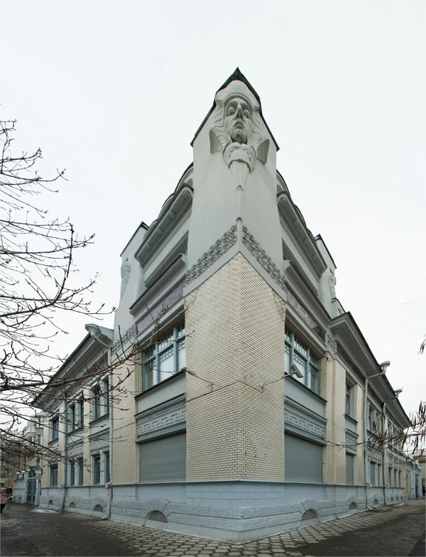 Здание тяготеет к рациональному модерну. Его композиция подчёркнуто симметрична. Пилон и окно — два основных элемента, чередование которых формирует фасады. В отделке особняка использованы глазурованный кирпич и керамическая плитка. По контрасту с фасадной плоскостью решены ключевые фрагменты – завершения угловых пилонов (маска сфинкса и фигуры загадочных птиц)[4] и входной портал (ещё одна маска, резная дверь). Остальные детали и части здания находятся в тесной формальной, пропорциональной и смысловой связи: тема строенных полукруглых окошек полуподвала угадывается в парапете третьего этажа и решётках ограждений, мелкая клетка оконных переплетов помогает избежать диссонанса самых разных по размерам проёмов; в этом же ритме движется орнамент по междуэтажному карнизу[1].