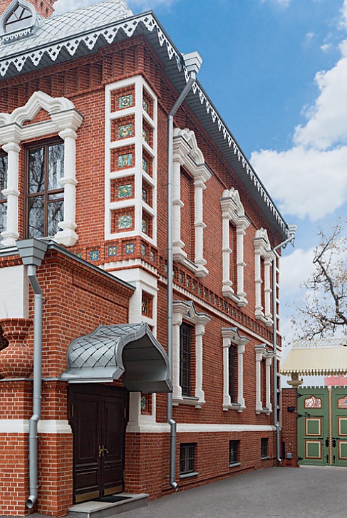 Подъезжаем к прелестнейшему особняку, выстроенному по рисунку Васнецова. Спокойные, гармоничные пропорции, славный древнерусский стиль, украшения и фризы майоликовые[6].