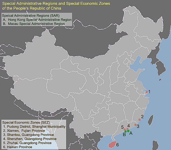В рамках экономической реформы и политики открытости миру, с 1980 по 1984 гг. в Китае созданы специальные экономические зоны (СЭЗ) в Шаньтоу, Шэньчжэне и Чжухае в провинции Гуандун, в Сямэне в провинции Фуцзянь. Также вся островная провинция Хайнань назначена особой экономической зоной.