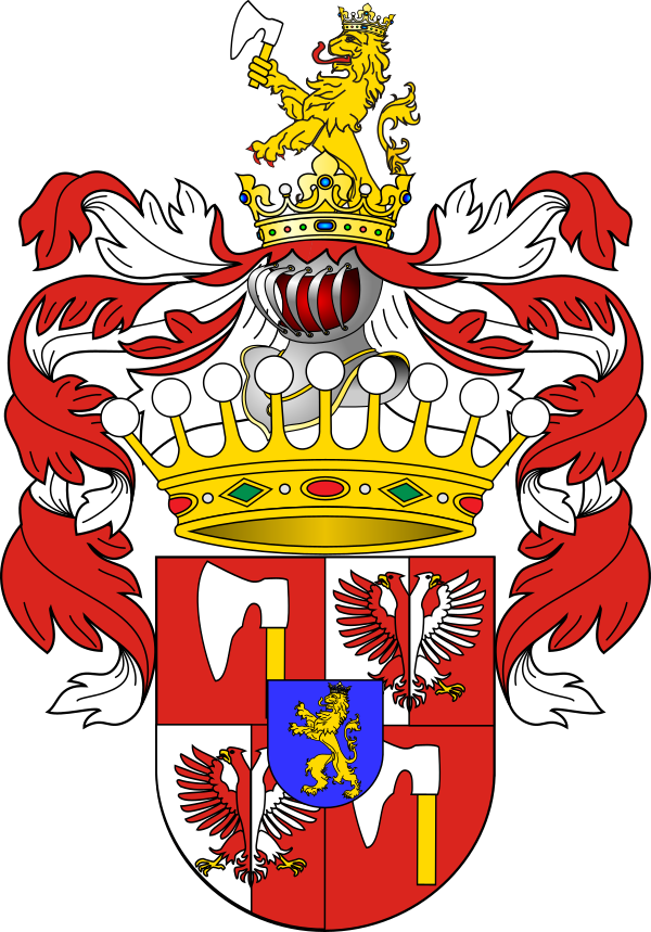 Щит увенчан графской короной, над которой шлем с дворянской короной. Нашлемник: возникающий золотой коронованный лев, держащий серебряный топор. Намёт на щите красный, подложенный серебром. Девиз: «Krzyż obrona, krzyż podpora, Dzieci naszego Topora».