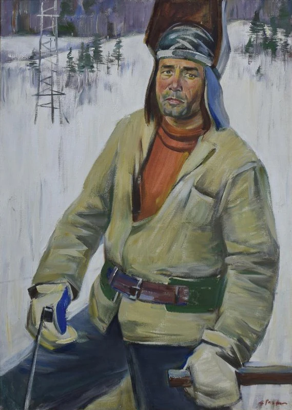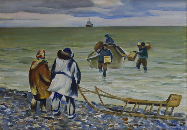 На фоне заснеженного пространства изображён мужчина, сидящий на нарте. Он одет в малицу, поверх которой надета тёмная маличная рубаха, а на голове находится шапка с незавязанными завязками. На ногах мужчины — коричневые кисы, подвязанные красными лентами. В руках, лежащих на коленях, он держит сигарету. Слева от мужчины изображены пять собак: две лежат, две сидят и одна стоит, что подчёркивает бытовую сцену с элементами собачьей упряжки.