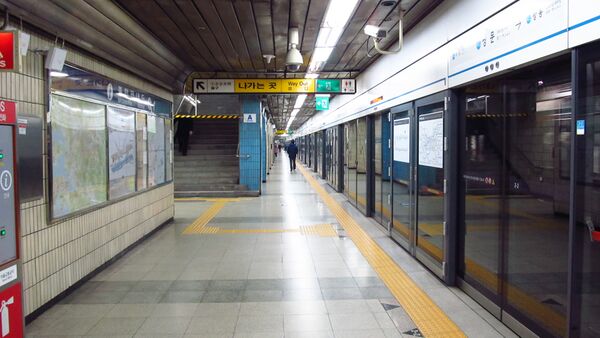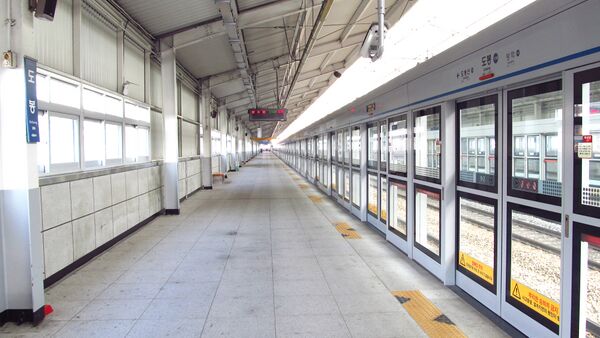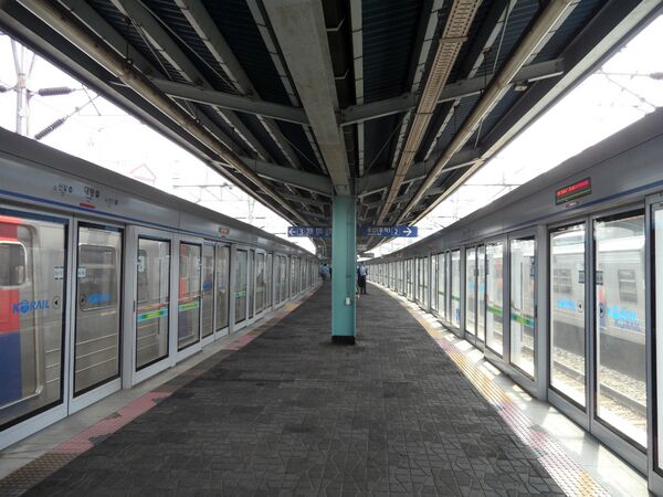 | Платформа станции Тодаймаэ с уложенным тактильным покрытием и установленными платформенными раздвижными дверьми. | |