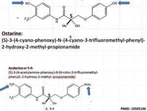 Структура остарина не была официально опубликована, и в связи с этим остарин ошибочно связывали с другим соединением из того же класса селективных модуляторов андрогеновых рецепторов (SARM), известным как андарин[5]. В то же время структура остарина, его химический компонентный состав были раскрыты в патентных базах данных, к примеру, во Всемирной организации интеллектуальной собственности (WIPO)[6], а также стали предметом обсуждения в первичной научной литературе[7]. Остарин, также как и андарин относят к арил пропионамидам — виду селективных модуляторов андрогеновых рецепторов (SARM), наряду с другими — хинолинами, хинолинонами и бициклическими гидантионами. Однако в отличие от последних арил пропионамиды (остарин и андарин) в исследованиях показывают наибольшую эффективность[8]. Остарин отличается от андарина цианозаместителями на фенильных кольцах, которые заменены нитро-и ацетамидо-фрагментами.