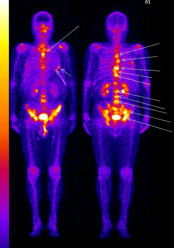 В настоящее время поиск метастазов в скелете — довольно сложная задача, где наиболее чувствительным и специфичным методом является сцинтиграфия остеотропными радиофармпрепаратами. Сцинтиграфические находки выглядят как единичные или множественные, равномерные — неравномерные, фотопенические или гепераккумулированные очаги и т. д.