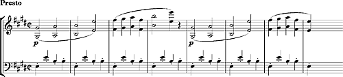 В энергичном скерцо Квартета № 14 до-диез минор, соч. 131 Бетховена есть гармонически статичный эпизод с «повторяемостью, напоминающей детскую песенку»[13], где остинато делят альт и виолончель, поддерживая мелодию в октавах у первых и вторых скрипок: