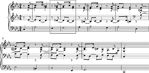 Первая вариация, которую Бах строит над этим остинато, представляет собой мягко синкопированный мотив в верхних голосах: