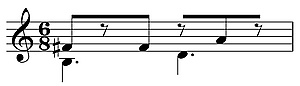 Многие инструменты Африки к югу от Сахары исполняют остинатные мелодии. К ним относятся ламеллофоны, такие как мбира, а также ксилофоны — балафон, бикутси, гиль и др. Остинато исполняют и на струнных инструментах, например, кора, а также на ансамблях колокольчиков ганкокви и ансамблях настроенных барабанов. Часто африканские остинато содержат синкопы или перекрёстный ритм, противоречащие метрической структуре[19]. Некоторые остинато создают полные перекрёстные ритмы, сочетая основные доли и перекрёстные доли. В примере ниже гиль воспроизводит трёхдольный ритм против двухдольного (гемиола): левая рука (низкие ноты) играет две основные доли, правая (высокие ноты) — три перекрёстные[20].