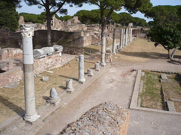При Траяне население Остии превысило 50 000 жителей. Главная улица (decumanus maximus) была шириной 9 м и длиной почти 2 км и проходила параллельно прежнему руслу Тибра. Вдоль неё располагались общественные здания: театр, храм Августа, Капитолий, посвящённый триаде богов (Юпитеру, Юноне и Минерве), термы и т. д.