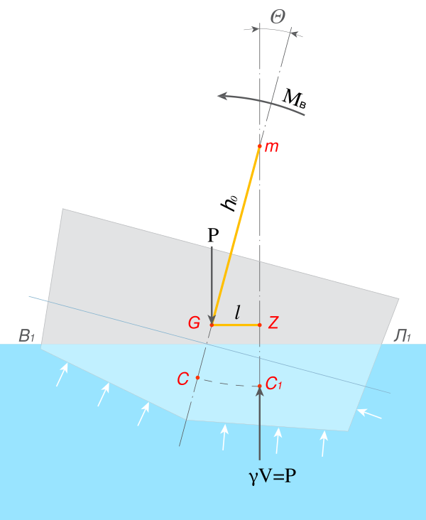 Центр тяжести G при таком наклонении не меняет своего положения, а центр величины (ЦВ) С как центр тяжести погруженного объёма перемещается по некоторой кривой СС1 в сторону наклонения и занимает новое положение C1. Перемещение центра величины происходит вследствие изменения формы погруженного объёма: с левого борта он уменьшился, а с правого борта увеличился. Сила плавучести γV, приложенная в центре величины, направлена по нормали к траектории его перемещения.