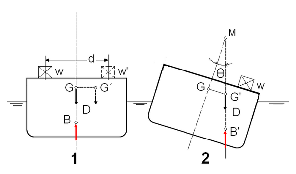 В результате смещения ЦВ при наклонении линии действия силы веса и силы плавучести смещаются и образуют пару сил. Если плечо пары положительно, возникающий момент mв действует в сторону восстановления равновесия, то есть спрямляет. Тогда говорят, что судно остойчиво. Если ЦТ расположен выше метацентра, момент может быть нулевым или отрицательным, и способствовать опрокидыванию — в этом случае судно неостойчиво.