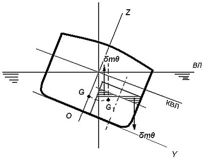 Если жидкость заполняет цистерну не полностью, то есть имеет свободную поверхность, занимающую всегда горизонтальное положение, то при наклонении судна на угол θ жидкость переливается в сторону наклонения. Свободная поверхность примет такой же угол относительно КВЛ.