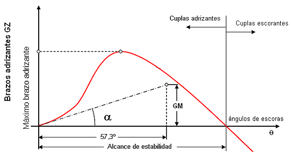 Диаграммой остойчивости называется зависимость восстанавливающего усилия от угла наклонения. Иногда называется диаграммой Рида, в честь инженера, который ввел её в обиход. Для поперечной остойчивости (для которой и была исходно составлена Ридом) координатами будут угол крена Θ и плечо восстанавливающего момента GZ. Можно заменить плечо на сам момент M, от этого вид диаграммы не меняется.