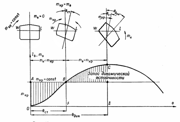 Если обратиться к диаграмме статической остойчивости, работа выражается площадью под кривой восстанавливающего момента mв. Соответственно, динамический угол крена θдин можно определить из равенства площадей OAB и BCD, соответствующих избыточной работе восстанавливающего момента. Аналитически та же работа вычисляется как: