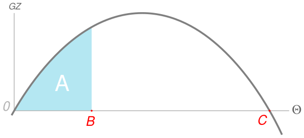 Площадь под кривой для текущего угла B представляет работу A восстанавливающего момента и является мерой динамической остойчивости.
