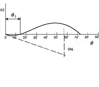 Начальная точка O, она же обычно точка равновесия. В этот момент крен Θ = 0, спрямляющий момент отсутствует GZ = 0. Если почему-либо начальная остойчивость отрицательна, точка равновесия может не совпадать с началом координат. Тогда GZ = 0 при Θ = Θ1.