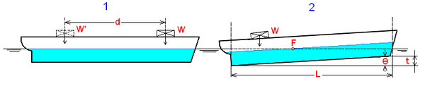 Приём груза в произвольное место можно представить как приём этого груза без изменения крена и дифферента, а затем перенос его в назначенное место. Условием неизменности крена и дифферента приема груза р является расположение его центра тяжести на одной вертикали с центром величины дополнительно входящего в воду объёма δV, который равен p/γ, где γ — удельный вес воды. При приёме относительно малого груза можно считать, что для исключения крена и дифферента он должен быть помещен на одну вертикаль с центром тяжести F исходной площади ватерлинии.