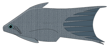 - Беспанцирные[58], бесщитковые[6][21] или анаспиды[4][59] (Anaspida). Филогенетическое положение точно не установлено[60], иногда их выделяют из состава Cephalaspidomorphi[21]. Известны около 20 родов (в некоторых системах больше)[6] из силура и девона Европы и Северной Америки. Длина — 10—15 см. Окостенения слабо развиты (что сильно затрудняет изучение этих животных), вместо массивного головного щита были небольшие пластинки и чешуя. Кроме хвостового плавника, у некоторых был маленький анальный, а кроме того, парные плавники — грудные или тянувшиеся на большую длину вдоль нижней стороны тела[60][61][21]. Жаберных отверстий 6—15 пар. Форма тела веретеновидная, и из-за этого они напоминали рыб сильнее всех остальных остракодерм[4].
