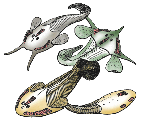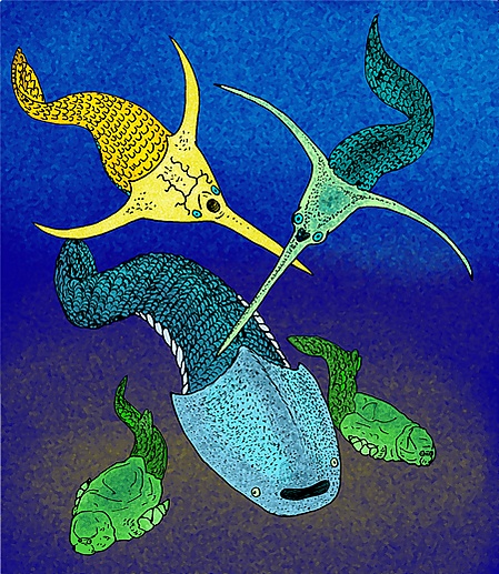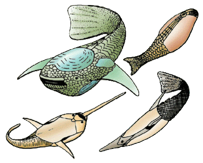 - Разнощитковые[6][21] или гетеростраки[4][53] (Heterostraci). Большая и разнообразная группа. Известно около 300 видов из силура и девона Европы, Сибири и Северной Америки. Самые маленькие имели размер 2 см, а самые большие — 1,5 м[5], а возможно, и 2 м[4][6]. Костное покрытие головы состояло из различного числа пластин — от одной до многих. Эндоскелета почти[8] не было[26]. Настоящих плавников, кроме хвостового, не имели, но у некоторых по бокам тела были парные костные пластинки, которые работали как рули. Глаза очень маленькие, по бокам головы. Жаберных отверстий только одна пара[21][54].