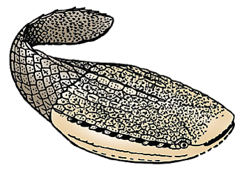 - Арандаспиды[6][21] (Arandaspida). Иногда их включают в состав разнощитковых[4][46]. 2—4 монотипических рода из ордовика Южной Америки и Австралии[23]. В длину достигали около 20 см[27], иногда до 35 см[47][6]. Передняя часть тела покрыта двумя большими, но тонкими костными пластинами: спинной и брюшной (с рядом мелких пластинок между ними), задняя — чешуёй[6][23]. Внутренних окостенений почти не было. Имели только один плавник — хвостовой. Жаберных отверстий много (более 10 пар). Примечательный признак — пара отверстий в передней части спинного щита, которые обычно интерпретируются как парные пинеальное[6][21][26] или пинеальное с парапинеальным[48][16] отверстия (очень редкая, хотя и не уникальная[49], ситуация среди позвоночных), а иногда — как выходы эндолимфатических протоков[23].