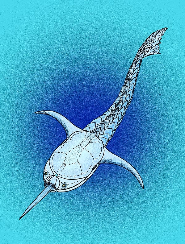 - Костнощитковые, костнопанцирные[6][21], остеостраки[64] или цефаласпиды[4] (Osteostraci). Изучены лучше всех остальных остракодерм. Большая группа (около 40 родов[6] и 200 видов) из силура и девона Евразии и Северной Америки[65]. В длину достигали от 2 см[64] до 60 см[21] (по другим данным, и до 1 м[65]). Имели массивный череп с внутренними окостенениями, покрытый пластинами дермальной кости (головным щитом), обычно с выростами по бокам. Кроме хвостового плавника, некоторые имели один или два спинных, и, возможно, анальный; обычно были и мускулистые парные грудные плавники. Вероятно, относительно хорошо плавали[6]. Жаберных отверстий около 10 пар[64][21][4]. Самый заметный уникальный признак — три поля на головном щите, которые интерпретируются как следы электрических органов[24], электрорецепторов[25] или рецепторов давления[4].