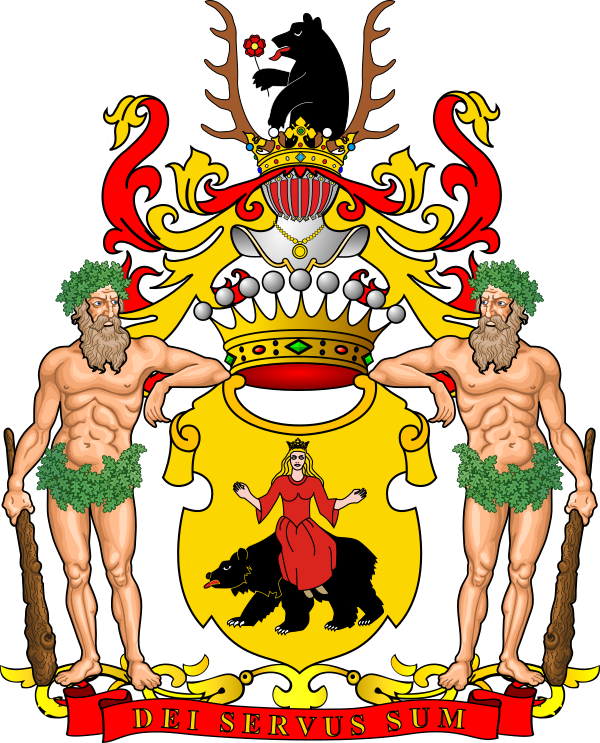 Щит увенчан графской короной, над которой дворянский шлем. Нашлемник: два оленьих рога, между которыми виден стоящий на задних лапах, выходящий до половины чёрный медведь; левая передняя лапа опущена, в правой он держит розу. Намёт червлёный подложенный золотом. Щитодержатели: два диких человека.