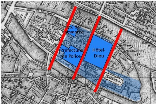 В XIX веке Сите претерпел большие изменения: не считаясь с исторической ценностью зданий острова, градостроитель барон Осман снёс все постройки между королевским дворцом и собором. На их месте были сооружены здания префектуры полиции и коммерческого трибунала. Также старое здание Отеля Дьё, ранее располагавшееся частично на острове и частично на левом берегу, было снесено и заменено бо́льшим (площадью 3 га) несколькими метрами дальше. Между новыми зданиями были проложены три прямые улицы, переходящие в мосты.
