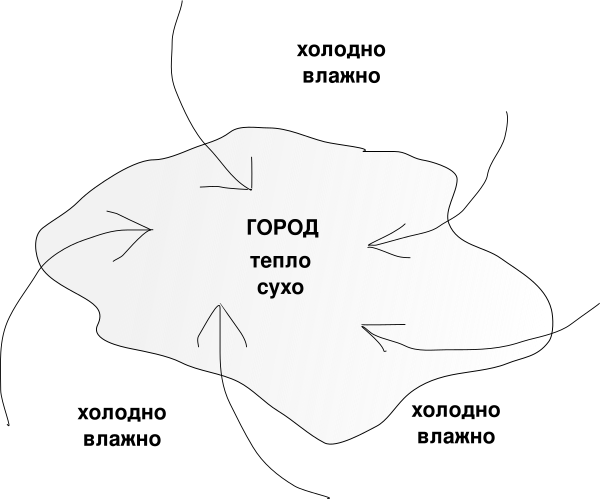 Для большинства городов разница в температуре между городской и окружающей сельской местностью наибольшая в ночное время. Типичная разница температур составляет несколько градусов между центром города и окружающими пригородами[7][8]. Разница в температуре между внутренним городом и его окрестностями часто упоминается в сводках погоды, например, 20 °C в центре города, 18 °C в пригородах". «Среднегодовая температура воздуха в городе с населением 1 миллион человек и более может быть на 1,0-3,0 °C теплее, чем в его окрестностях. Вечером разница может достигать 12 °C»[9][10].