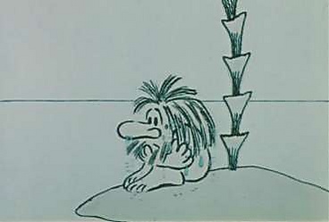 На маленьком островке посреди океана, где растёт только одна пальма, сидит обросший человек. Время от времени мимо него проплывают суда, которым он машет платком, однако они не замечают его. Корабли, пристающие к острову, не забирают человека оттуда. Так, на одном из кораблей люди прибывают для того, чтобы спилить пальму на дрова и увезти её, на другом корабле оказывается священник-миссионер, который вручает человеку Библию, третий корабль устанавливает на острове флаг своего государства. Люди приезжают, чтобы сделать селфи с отшельником, продавцы — чтобы порекламировать свои товары. Привозят нефтяную вышку, которая бурит скважину прямо посреди островка. Когда из скважины начинает литься нефть, к острову приплывает множество кораблей, которые качают нефть по трубам. Нефть заканчивается, и человек остаётся посреди нефтяного пятна на месте островка. Мимо проплывает, держась за бревно, такой же обросший человек, который зовёт с собой главного героя. Они вдвоём уплывают по океану вдаль.
