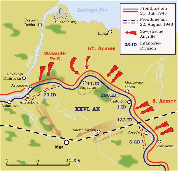 На этом фоне войска 67-й армии Ленинградского фронта и 8-й армии Волховского фронта в сентябре продолжали проводить кровопролитные локальные операции с огромными потерями обеих сторон, пытаясь захватить Мгинский выступ и Синявинские высоты с востока. На стороне противника все это время упорное сопротивление оказывал немецкий 561-й штрафной батальон. В ожесточённых боях 15-18 сентября 1943 года советские части 30-го гвардейского стрелкового корпуса Ленинградского фронта сумели на некоторое время частично взять штурмом одну из синявинских высот — высоту 43.3, однако высоту с отметкой 50.1, с которой был уже виден ближайший немецкий тыл, взять не удалось. После 19 сентября 1943 года 30-й гвардейский стрелковый корпус был отведен в тыл, а его заменила 11-я стрелковая дивизия 43-го стрелкового корпуса 67-й армии Ленинградского фронта. Взять высоту 50,1 было приказано другой — 43-й стрелковой дивизии 67-й армии Ленинградского фронта[45][46][42][43][44].