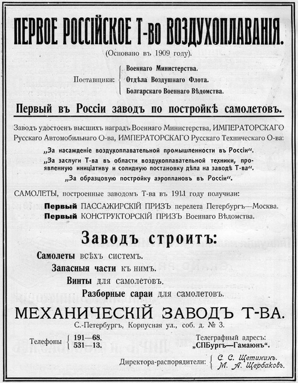 - Завод Первого Российского Товарищества Воздухоплавания — ПРТВ «С. С. Щетинин и Ко» (он же завод летательных аппаратов «Гамаюн»);