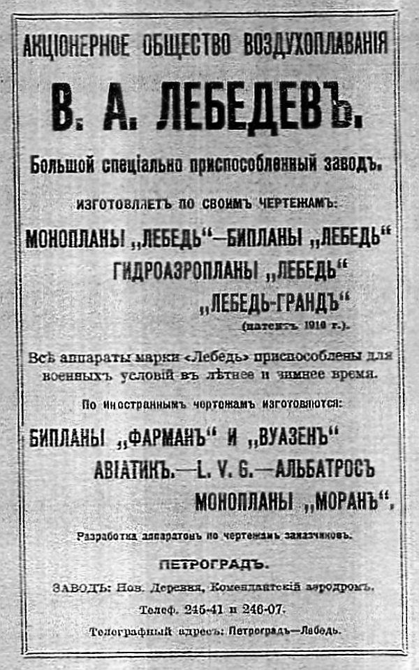 В апреле 1914 года, третий российский дипломированный пилот-авиатор Владимир Александрович Лебедев получил разрешение на строительство нескольких производственных помещений рядом с Комендантским аэродромом. Так возник авиационный завод «В. А. Лебедев», который стал выпускать самолёты, чаще всего аналоги зарубежных моделей.