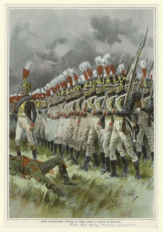 К 1811 году Французская империя с её вассальными государствами насчитывала 71 млн человек из 172 млн, населявших Европу[42]. На начальном этапе Наполеон смог собрать в поход против России, по разным источникам, от 400 до 450 тысяч солдат[43][44][45][46], из которых собственно французы составляли половину. Имеются свидетельства (в частности, генерала Бертезена) о том, что фактическая численность 1-й линии Великой армии составляла лишь приблизительно половину её списочного состава, то есть не более 235 тысяч человек, а командиры при подаче отчётов скрывали истинный состав своих частей. Данные русской разведки на тот момент давали ту же численность[47]. В походе принимали участие 16 разных национальностей: наиболее многочисленными после французов были немцы и поляки[П 13]. На основе союзных соглашений с Францией Австрия и Пруссия выделили 30 и 20 тысяч войск соответственно. После вторжения в Россию к Великой армии добавились подразделения численностью до 20 тысяч, сформированные из жителей бывшего Великого княжества Литовского.