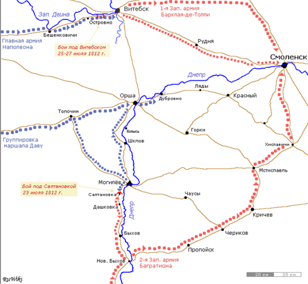 16 (28) июня была занята Вильна. 18 (30) июня к Наполеону прибыл генерал-адъютант Балашов, направленный Александром I с предложением вывести французские войска из России и заключить мир. Наполеон ответил отказом[122][123]. Устроив государственные дела в оккупированной Литве (было воссоздано Великое княжество Литовское), он выехал из Вильны вслед за своими войсками лишь 4 (16) июля[124].