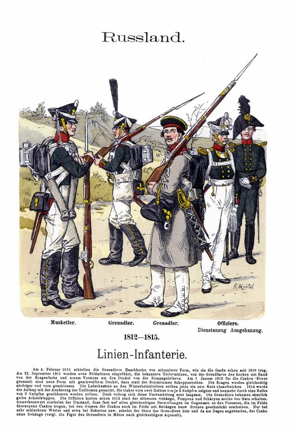 Оружейные заводы выпускали ежегодно 1200—1300 орудий и более 150 тысяч пудов бомб и ядер (ср.: французские заводы выпускали 900—1000 орудий). На Тульском, Сестрорецком и Ижевском оружейных заводах изготовлялось от 43 до 96 тысяч ружей в год[67], кроме того арсеналы могли отремонтировать почти такое же количество оружия[68], в то время как во всех французских заводах выпускалось около 100 тысяч ружей в год. Русское оружие того времени было относительно высокого качества и по тактико-техническим данным не уступало французскому. Тем не менее мощностей собственного российского производства не хватало для удовлетворения всех потребностей армии. Некоторые полки и даже дивизии были вооружены английскими или австрийскими ружьями[69]. Русская пехота была вооружена в основном гладкоствольными ружьями; некоторые стрелки имели нарезные штуцера или винтовальные ружья.