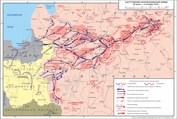 | 1) В приграничных армиях — 2) Прочие части русской армии — 3) В армиях вторжения — 4) Прочие части Великой армии (в Великую армию не входили войска во Франции и Испании) — 5) Авторы указывают, что списочная (но не фактическая) численность составляла 600 тысяч — 6) Автор указывает, что общая численность наполеоновских войск, вошедших в Россию в 1812 году — 608 тысяч | |||||||