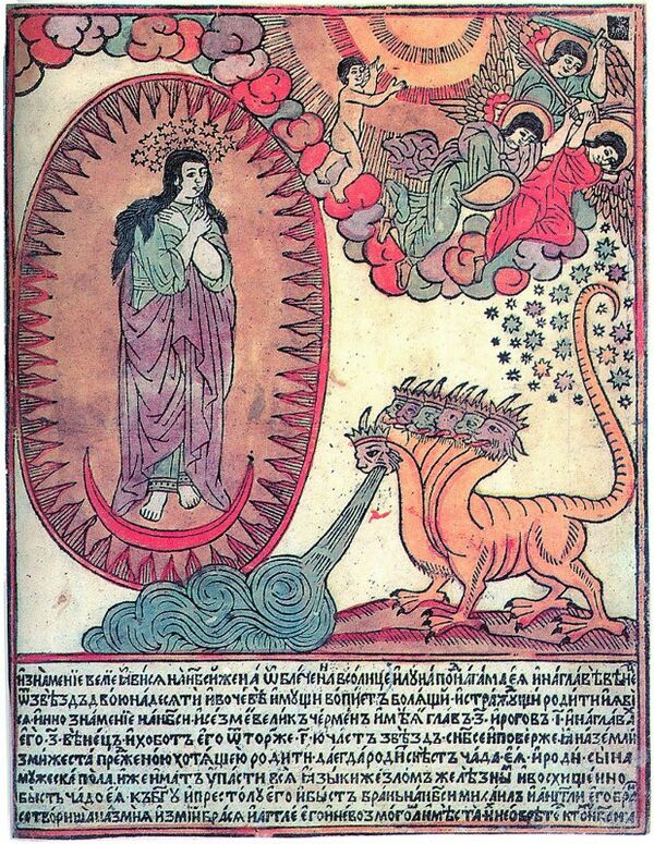 Иоанн видит в небе знамение — ему является Жена, облечённая в солнце, под ногами у которой луна, а на голове венец из звезд. Она беременна и готовится к родам. После этого в небе появляется другое знамение — большой красный семиглавый дракон. Своим хвостом он сшибает с неба на землю третью часть звезд. Дракон намеревается пожрать новорожденного Жены. Младенец появляется на свет, ему суждено пасти все народы. Дракон не успевает схватить Младенца, так как того забирают на небеса к Богу и его престолу.