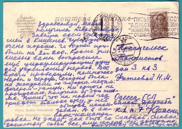 Сообщаю, что я жив, здоров. Адреса не предоставляю, потому что не знаю, где буду находиться завтра, но ваши письма дойдут до меня, если верно перепишете всё, что оттиснуто на почтовом штемпеле. Кланяюсь всем родным и знакомым.