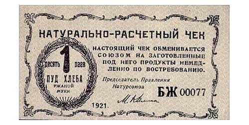 Юрий Ларин писал, что постоянное отмирание денег возрастает по мере возрастания организованности советского хозяйства, и деньги утратят своё значение как сокровище и останутся только тем, чем они являются на самом деле: цветной бумагой.