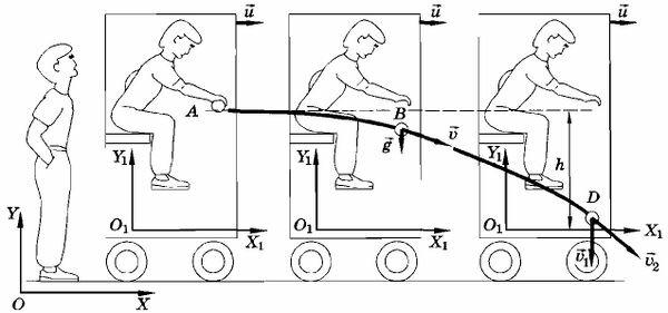 Пассажир, находящийся в движущемся равномерно относительно поверхности Земли вагоне, выпускает из рук мяч. Он видит, как мяч падает относительно вагона вертикально вниз с ускорением . Свяжем с вагоном систему координат (см. рис.). В этой системе координат за время падения мяч пройдёт путь , и пассажир отметит, что мяч упал вертикально вниз и в момент удара о пол его скорость была равна .
