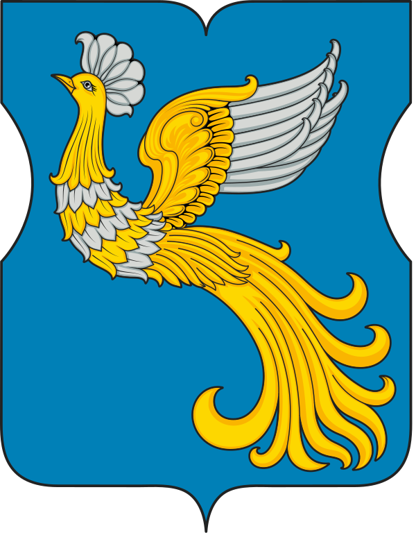 В лазоревом поле – золотая летящая косвенно вправо с воздетыми крыльями райская птица, имеющая серебряные хохолок, глаза и маховые перья на крыльях, на груди три ряда через один таковые же перья, а крайние перья хвоста - лировидные.