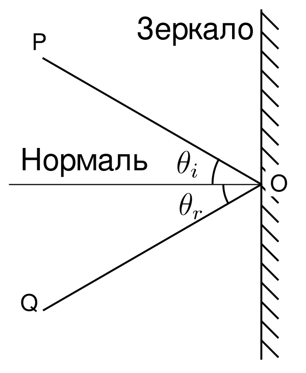 Закон отражения света — устанавливает изменение направления хода светового луча в результате встречи с отражающей (зеркальной) поверхностью: падающий и отражённый лучи лежат в одной плоскости с нормалью к отражающей поверхности в точке падения, и эта нормаль делит угол между лучами на две равные части[2]. Широко распространённая, но менее точная формулировка «угол отражения равен углу падения» не указывает точное направление отражения луча. Тем не менее, выглядит это следующим образом: